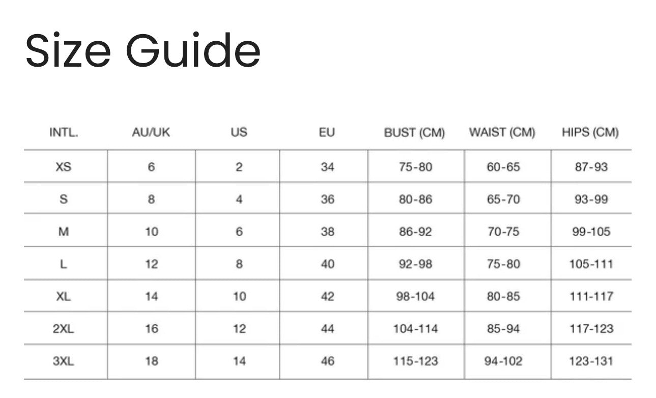 MJ is wearing a Size S. She usually wears a size AU8, is 173cm (5’7”) tall, with an 86cm bust (33.8”), 64cm (25.1”) waist & 89cm (35”) hips.